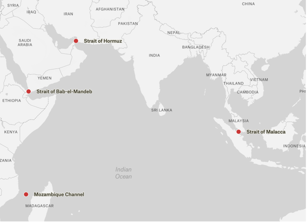 Another importance of Indian Ocean lies in its service as a ‘strategic highway’ that connects the Middle East, Southeast Asia, East Asia, Europe, and the Americas and is crucial for global economic security (Dutta & Choudhury, 2024). Today, the strategic rivalries in the region revolve around maintaining military and strategic influence over the crucial chokepoints along the sea lines of communications (SLOC). Indian Ocean certainly has crucial choke points which are very vulnerable. It has 4 choke points, the Strait of Malacca, the Strait of Hormuz, the Strait of Bab-el-Mandeb, and the Mozambique Channel. Through these choke points almost 36 million barrels of oil, which is 40% of global oil production, transit to their destinations (Baruah, et al., 2023). About 80% of China’s and India’s as well as 90% of Japan’s oil imports flow through these points, marking their importance for these countries. In fact, India’s 2004 Maritime Military Strategy declared the ‘control of choke points as bargaining chip in the international power game’ (Ministry of Defence, India, 2004).This leads us to the strategic interests of India and China in the region.