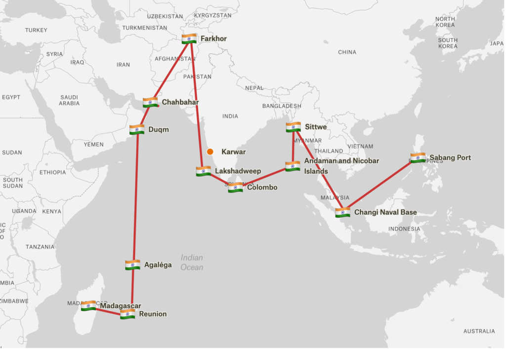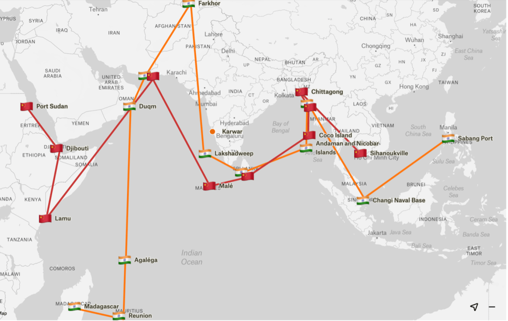 The network of naval bases and commercial facilities that China has built in and around Indian Ocean was first referred as ‘String of Pearls’ in a 2005 U.S Department of Defence report, which pointed out the encirclement of India (Dutta & Choudhury, 2024). Key elements of this strategy are port development in Pakistan (Gwadar), Sri Lanka (Hambantota), Bangladesh (Chittagong), Myanmar (Kyaukpyu); infrastructure development like the Belt and Road Initiative (BRI); establishment of Military facilities in Djibouti and enhancement of diplomatic and economic ties with Indian Ocean littoral states. This strategy has strategic objectives like securing sea lanes, military power projection and extending China’s influences and alliances. But securing sea lanes is perhaps the key objective as Nicolas Weimar contends ‘the legitimacy and political fate of the Communist Party is closely linked to China’s continuous economic development and that is dependent on uninterrupted access to energy sources’ (D.Weimar, 2013) and these resources passes through Malacca Strait choke point which is a point of vulnerability for China. So, China must secure its SLOCs effectively for political and economic reasons. China has indeed established important presence in several port cities in the Indian Ocean, from Pakistan to Myanmar, dovetailing various relationships over the past decades, which certainly has been major irritant to India, intensifying the geopolitics in the region (Bastos, 2014). As a net effect of this strategy, the traditional hegemon in the Indian Ocean region, India, feels threatened by the increased Chinese interest in its backyard and has initiated its own strategy.